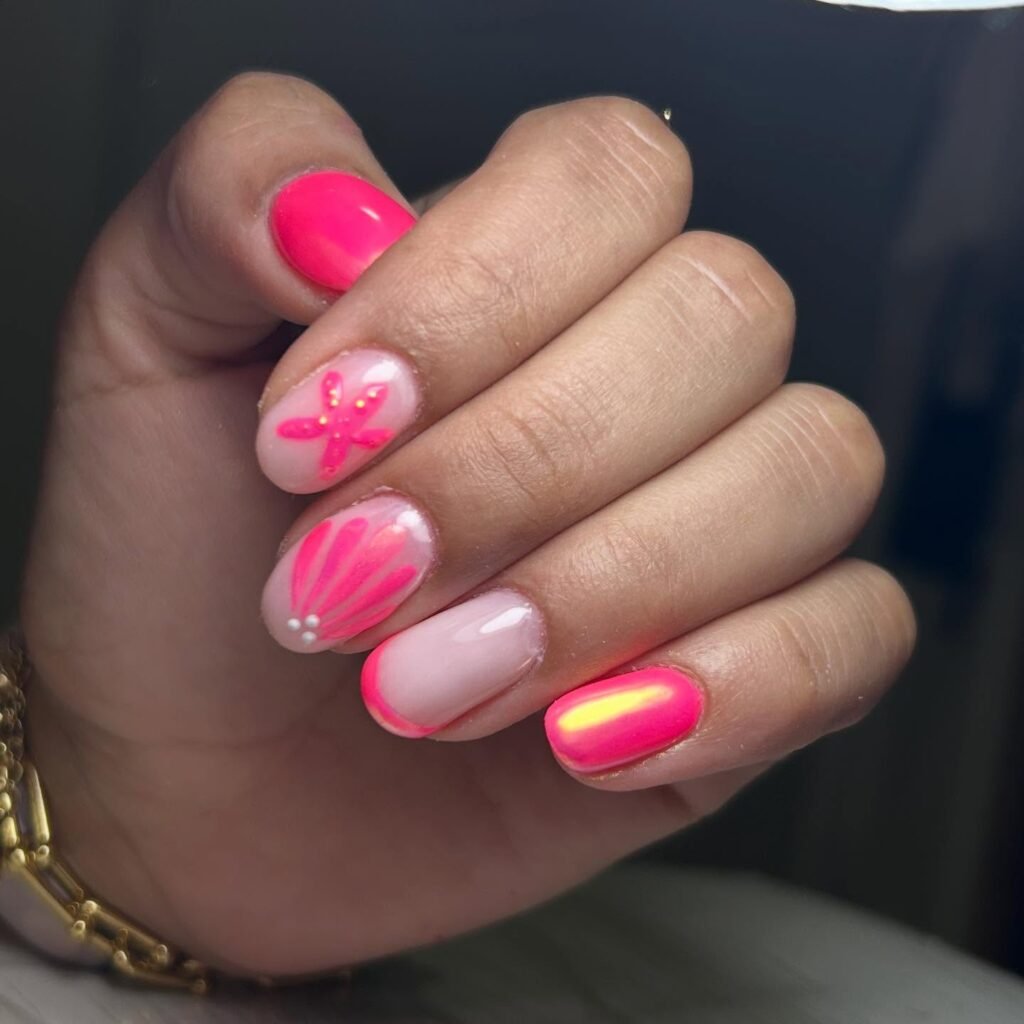 Neon pink and nude nails with starfish and seashell art scream summer fun and look like you’re always one flip-flop step away from the beach.